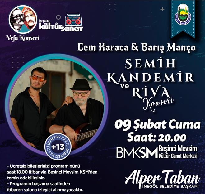 İnegöl Belediyesi, rock müziğin efsaneleri Cem Karaca ve Barış Manço için vefa konseri düzenliyor. 09 Şubat Cuma akşamı Semih Kandemir ve Riva’nın sahne alacağı konser, Beşinci Mevsim Kültür Sanat Merkezinde yapılacak.