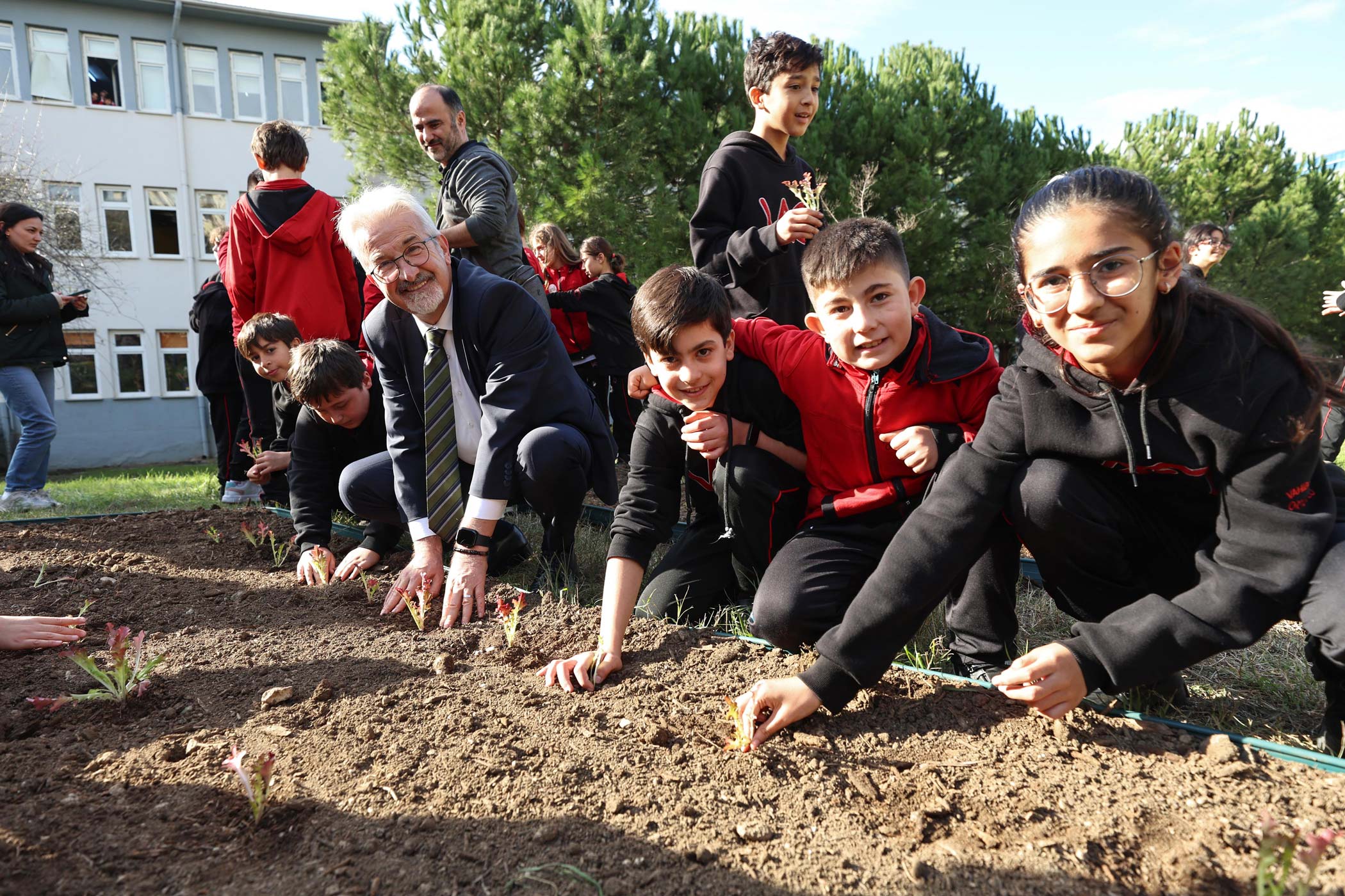 Nilüfer Belediye Başkanı Turgay Erdem, Vahide Aktuğ Ortaokulu öğrencileriyle birlikte okul bahçesinde oluşturulan alana çilek ve marul fidesi dikti.
