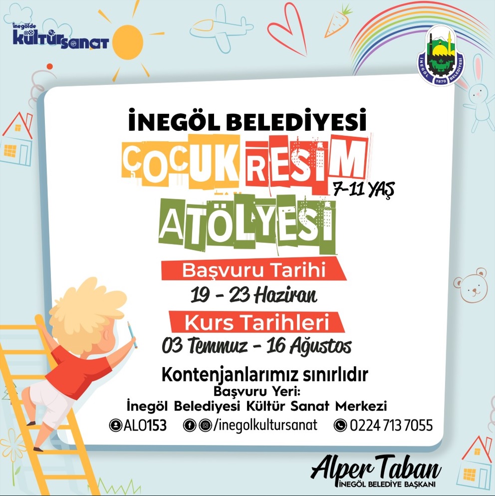 Kış döneminde Ekim-Haziran aylarında yoğun ilgiyle süren Çocuk Resim Atölyesi, yaz döneminde de çocukların yeteneklerini geliştirmek için devam edecek. Bayram sonrası İnegöl Belediyesi Kültür Sanat ve Gençlik Merkezi resim atölyesinde eğitimlerin verileceği kurs ile küçük yaşta çocukların resim yeteneklerini geliştirip karakalem ve teknik resim eğitimiyle geleceğin mimarlarını yetiştirmek amaçlanıyor. Kayıtların 19 Haziran itibariyle başladığı kursa, 7-11 yaş aralığındaki çocuklar katılabilecek. Çocuk Resim Atölyesi yaz kursu hafta içi Pazartesi, Çarşamba ve Cuma günleri gerçekleştirilecek. Çocuklarını kayıt yaptırmak isteyen velilerin İnegöl Belediyesi Kültür Sanat ve Gençlik Merkezine başvurmaları gerektiği ifade edildi. “Çocuk Resim Atölyesi Yaz Kursu” 03 Temmuz – 16 Ağustos tarihleri arasında gerçekleştirilecek. Çocukların hayal güçlerini sanatla bütünleştirip el becerilerini arttırmayı amaçlayan Çocuk Resim Atölyesi ile çocukların farkındalığı ortaya çıkarılacakken, aynı zamanda yaz tatillerini güzel bir aktivite ile geçirmeleri de sağlanmış olacak.
