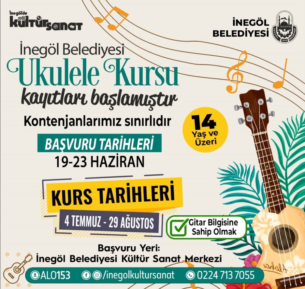 Ukulele kursu da 4 Temmuz – 29 Ağustos tarihleri arasında gerçekleştirilecek. Yine aynı şekilde başvurular Kültür Sanat ve Gençlik Merkezinden yapılacak. Ancak bu kursa katılmak için gitar bilgisine sahip olmak gerektiği ifade edildi.
