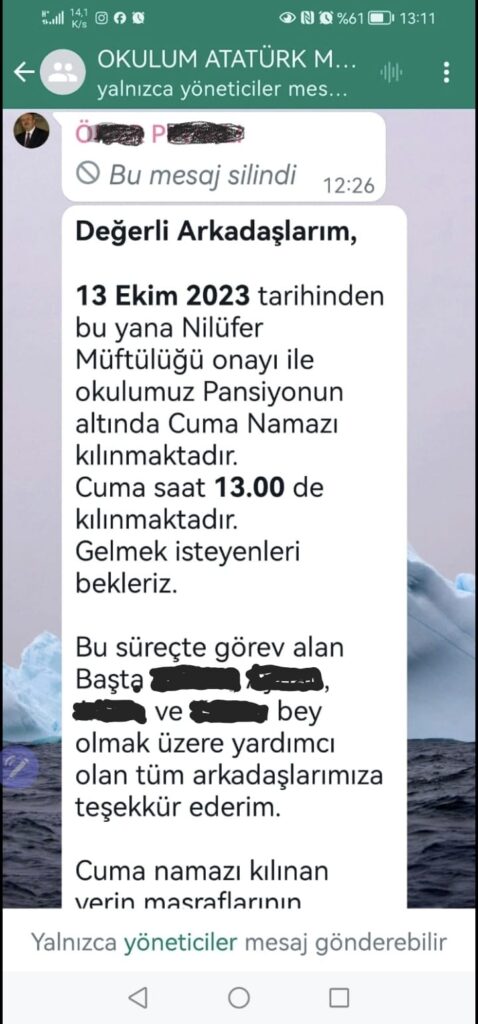 Eğitimin dinselleştirilmesi adımları her geçen gün hız kazanırken, bu yönde sayısız uygulama yasa yönetmelik tanımadan hayata geçirilmektedir. Bursa-Nilüfer Atatürk Mesleki ve Teknik Anadolu Lisesi Müdürü, öğretmenlere yazdığı talimat ile Müftülükten alınan onay sonrasında okulda cemaatle cuma namazlarının kılınacağını, bu nedenle “cuma namazı kılınan yer” olarak ifade ettiği mekânın düzenlenmesi masraflarının hayırseverler tarafından yapıldığını duyurarak öğretmenlerden de bu yönde maddi-manevi destek talebinde bulunmuştur.