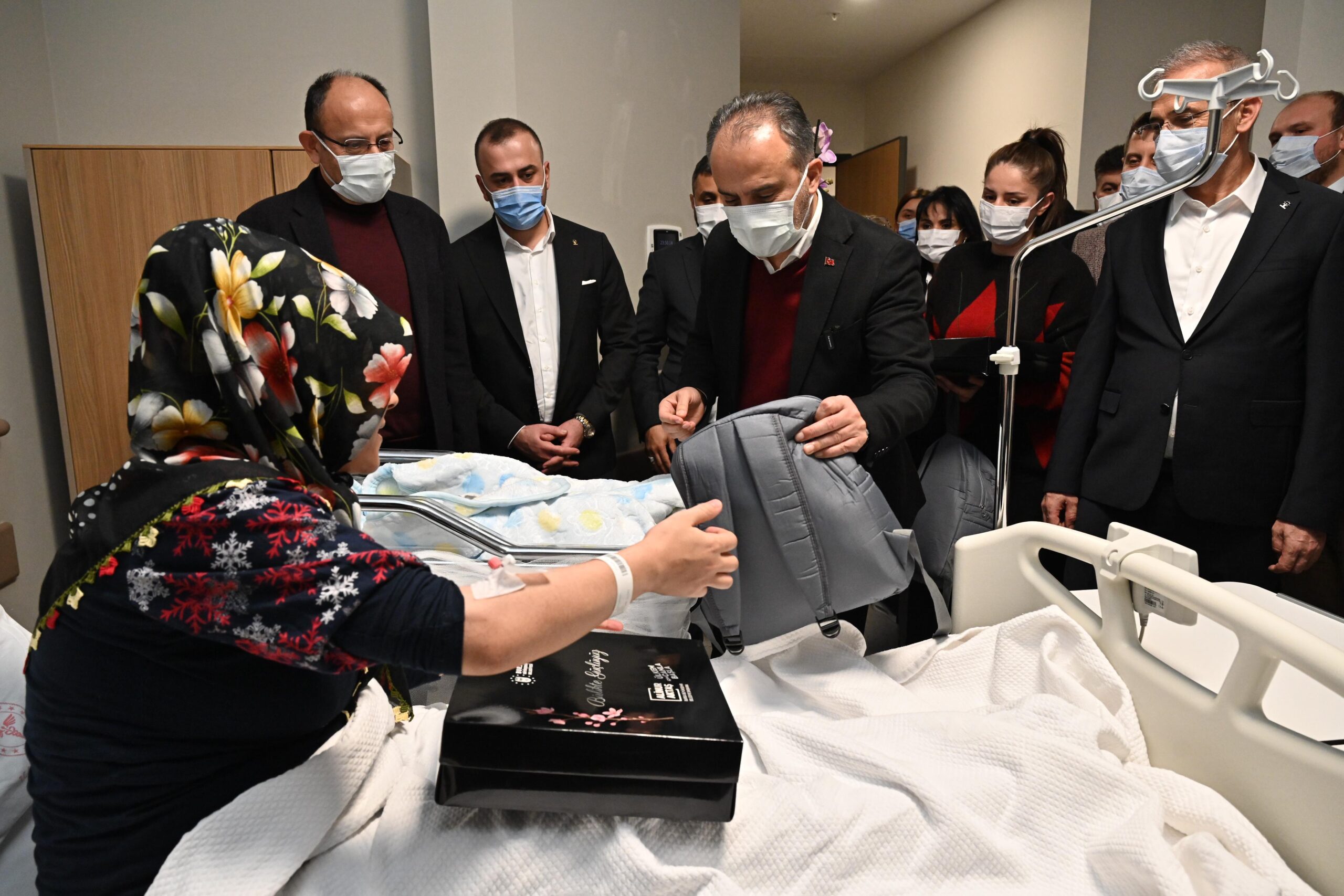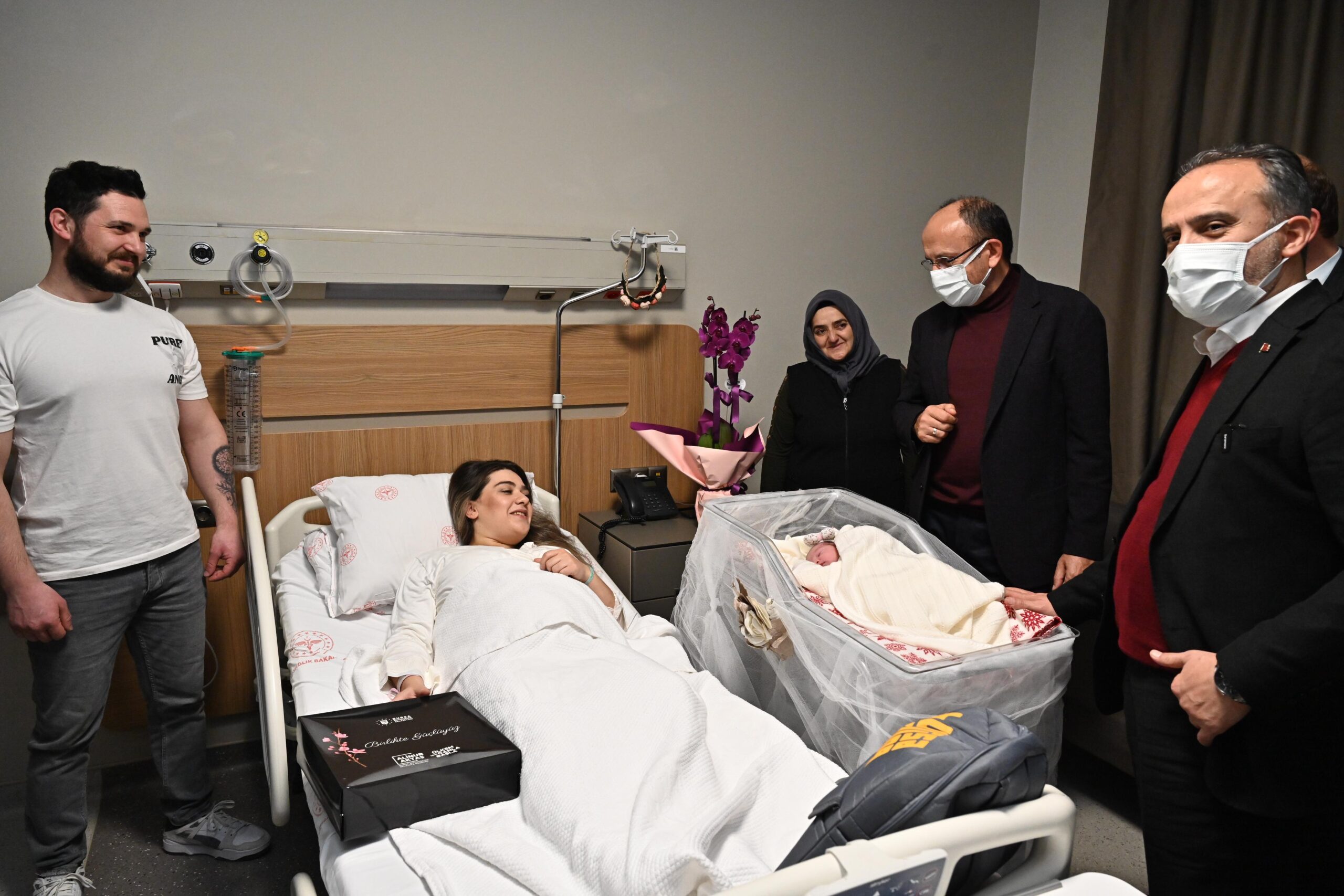 Başkan Alinur Aktaş, 2023’ün son ve 2024’ün ilk ziyaretini ise Bursa Şehir Hastanesi’ne yaptı. Başkan Aktaş ve beraberindeki Bursa Milletvekili Mustafa Yavuz, Başhekim yardımcısı Dr. Özlem Avcı, Sağlık Bakım Hizmetleri Müdürvekili Özlem Kavak ile birlikte hastane personeline çiçek ve çeşitli hediyeler verdi. Başkan Aktaş, bebekleri 2023 yılının doğan son bebeği olarak kayıtlara geçen Tuğba ve Şevket Sarı çiftini ziyaret etti. Çocuklarına Ali Asaf ismini veren Sarı çiftine çiçek ve bebek seti hediye edilirken, Başkan Aktaş minik bebeğe de altın taktı.