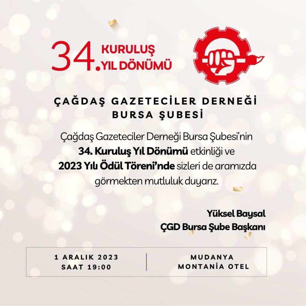 Kuruluş yıl dönümü etkinliği ve 2023 yılı Ödül Töreni 1 Aralık Cuma 19:00 Mudanya Montania Otel’de yapılacaktır.