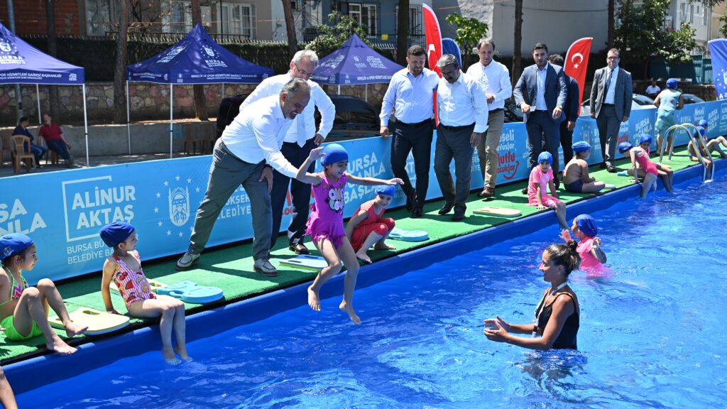 Bursa Büyükşehir Belediyesi, ‘Neşeli Havuzlar Mutlu Çocuklar’ projesi kapsamında kurulan portatif yüzme havuzları ile okul bahçelerini yüzme eğitim merkezlerine dönüştürdü. Çocukları eğitim aldıkları havuzda ziyaret eden Büyükşehir Belediye Başkanı Alinur Aktaş, “Çocuklarımızın neşesine şahit olmak büyük mutluluk” dedi.